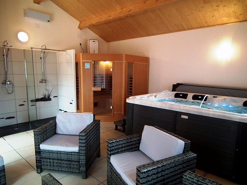 For relaxing with the family: 4-5 person infrared sauna, 4-5 person jacuzzi, showers, lounge, terrace, changing room, WC.