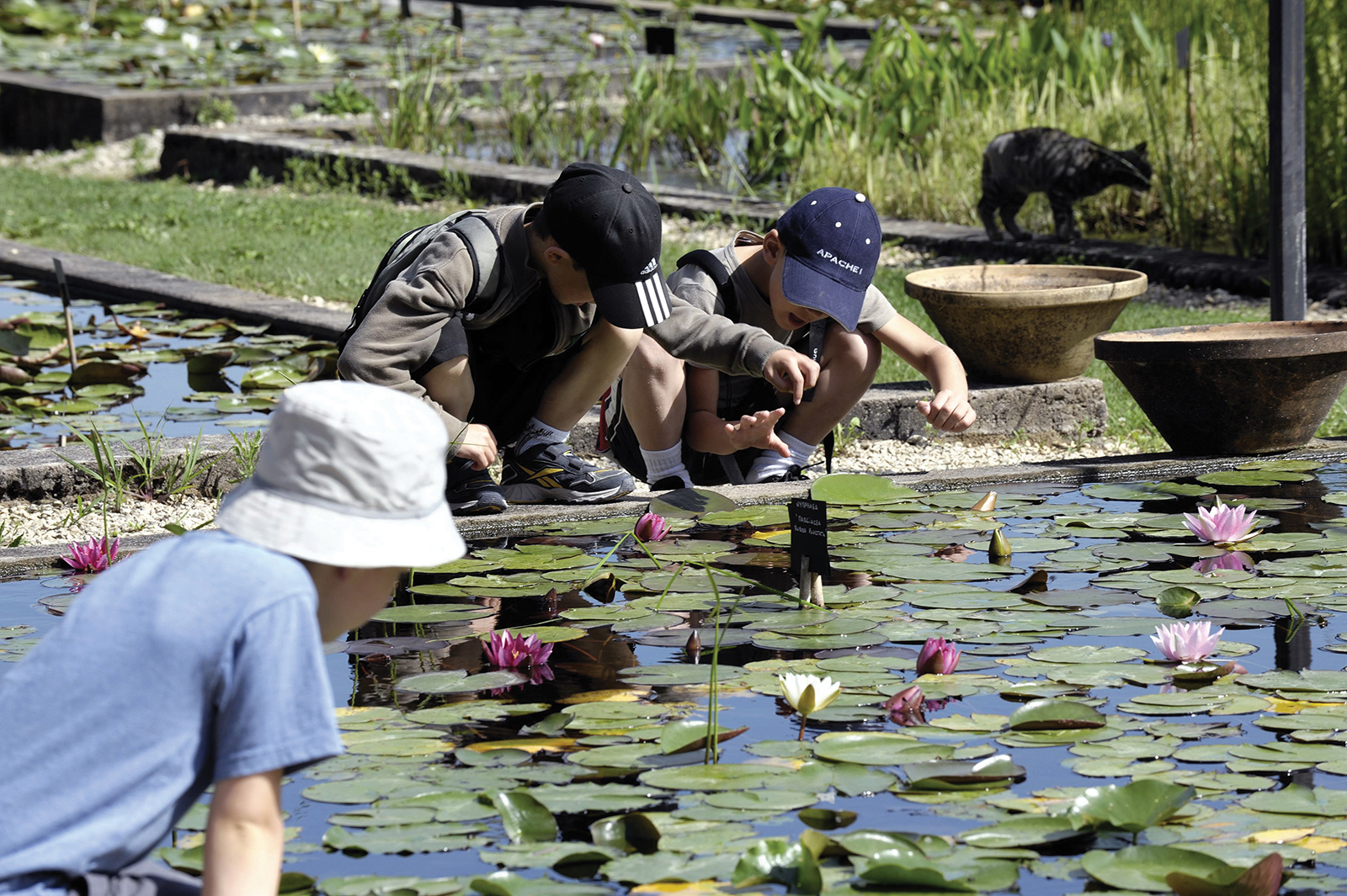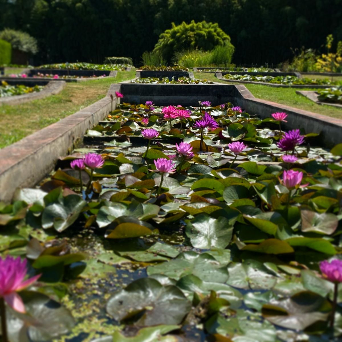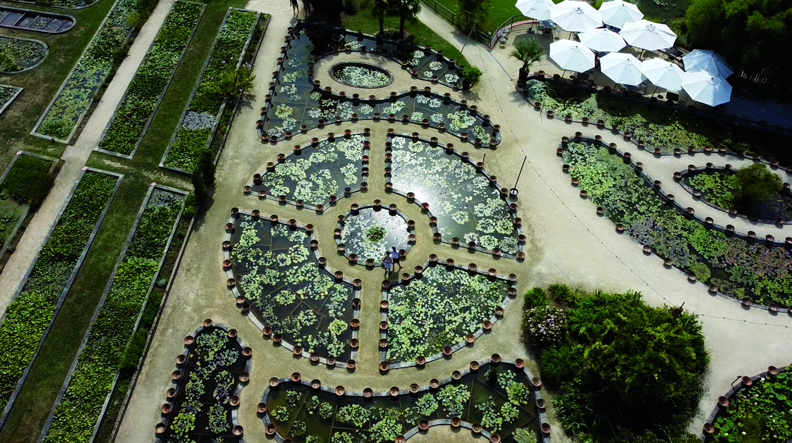 Les visiteurs peuvent parcourir des sentiers bordés de bassins où fleurissent de nombreuses variétés de nénuphars et de plantes aquatiques.
