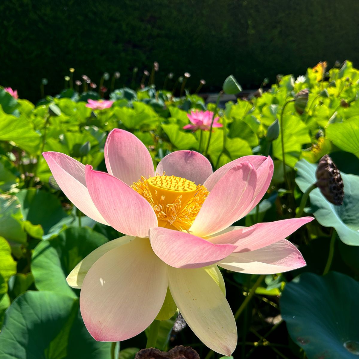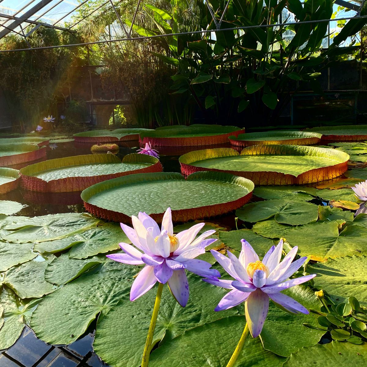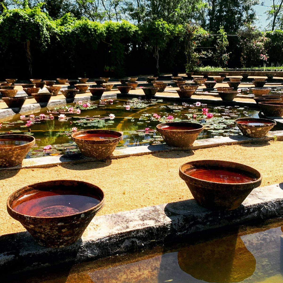 Les visiteurs peuvent parcourir des sentiers bordés de bassins où fleurissent de nombreuses variétés de nénuphars et de plantes aquatiques.