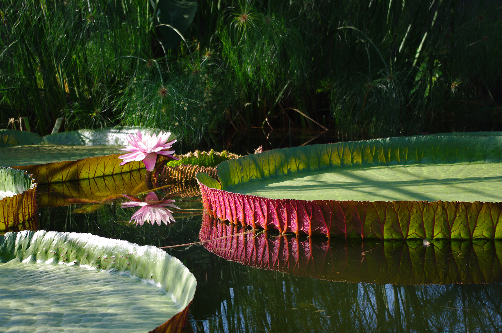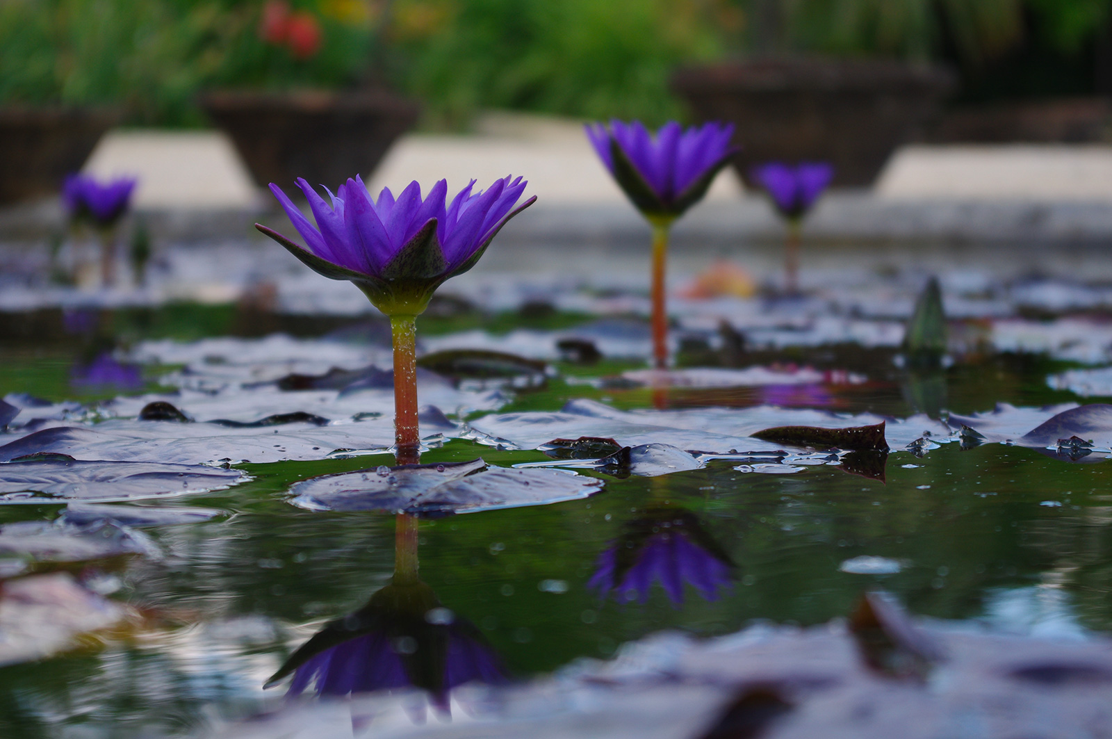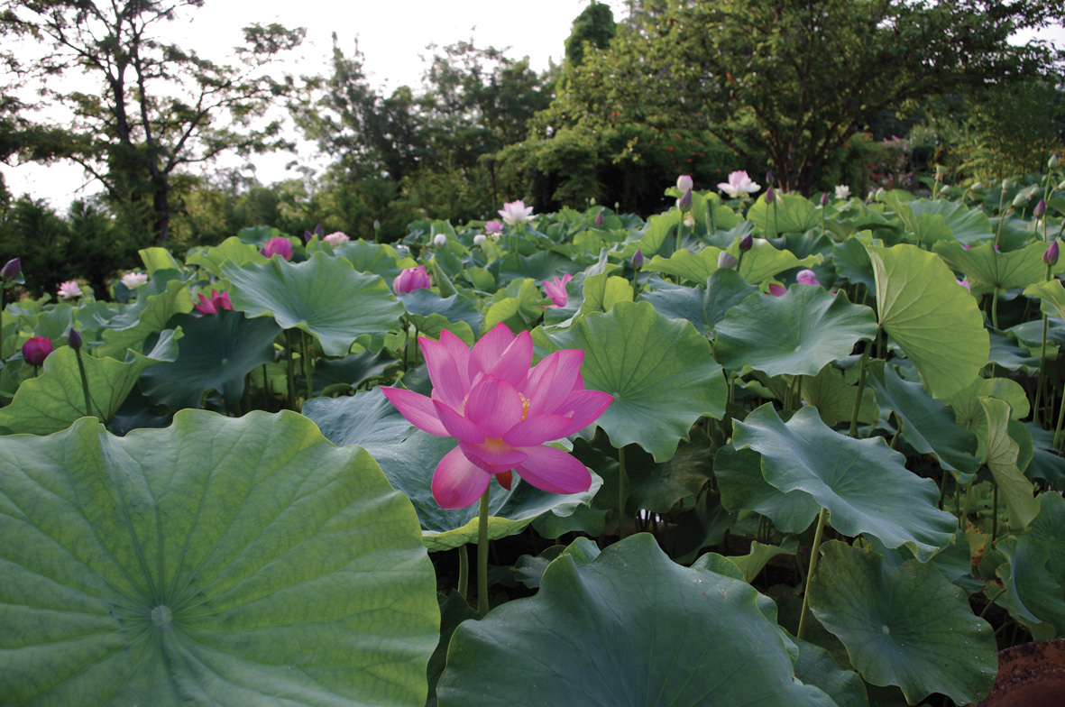 Les visiteurs peuvent parcourir des sentiers bordés de bassins où fleurissent de nombreuses variétés de nénuphars et de plantes aquatiques.